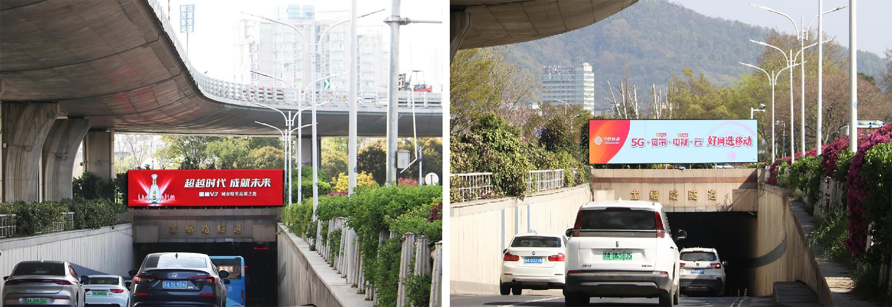 龙蟠路隧道位于南京内环北线,为快速内环通道的一部分,龙蟠路隧道连接贯穿南京火车站、玄武湖大道、新庄立交、中央路等,常年车流量密集庞大,因此该隧道具有很高的广告投放宣传价值。此LED广告显示屏位于隧道南北两面出口,屏幕四周毫无遮挡,视线极佳;传播视觉角度广,远眺角度十分的清晰。(LED屏规格:长9米 × 高2.2米 = 19.8平方米)