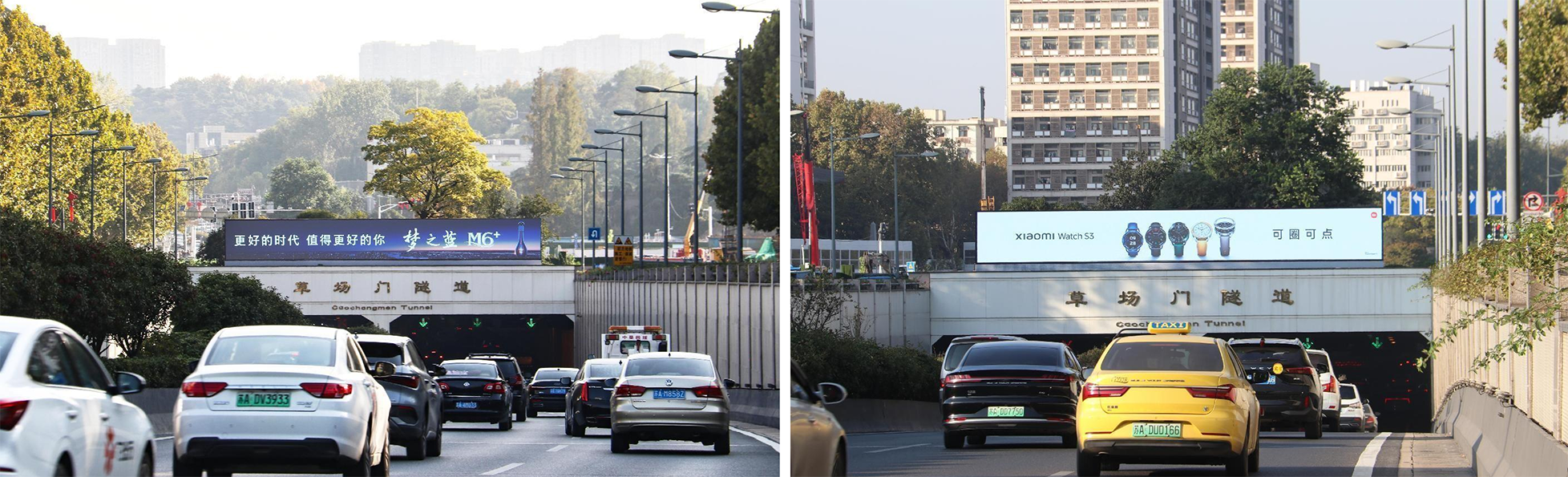 草场门隧道位于南京城西干道为快速内环通道的一部分,连接贯穿整个南京主城区与郊区,车流量十分密集,因此该隧道具有很高的广告投放宣传价值。此LED广告显示屏设置于隧道顶端南面与北面出口,屏幕四周毫无遮挡,视线极佳;传播视觉角度广,远眺角度十分的清晰。(LED屏规格:长20.48米 × 高2.56米 = 52.43平方米)