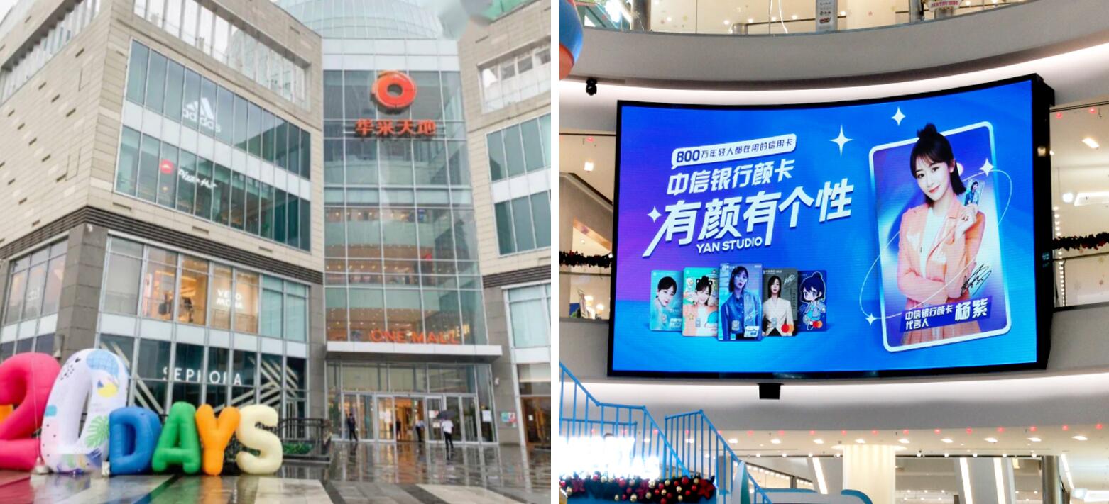 南京华采天地被定位为世界级生活中心,引进国际化、时尚化、潮流化、健康化生活方式和消费理念,按世界级水准建造设施,提供国际最前瞻的服务理念;注重生活体验型消费方式,拓展生活空间维度,打造 “第三生活空间”,满足除基本工作和家庭需求以外的一切美好需求。LED大屏设置于商场内中庭位置,清晰醒目,吸引顾客关注。